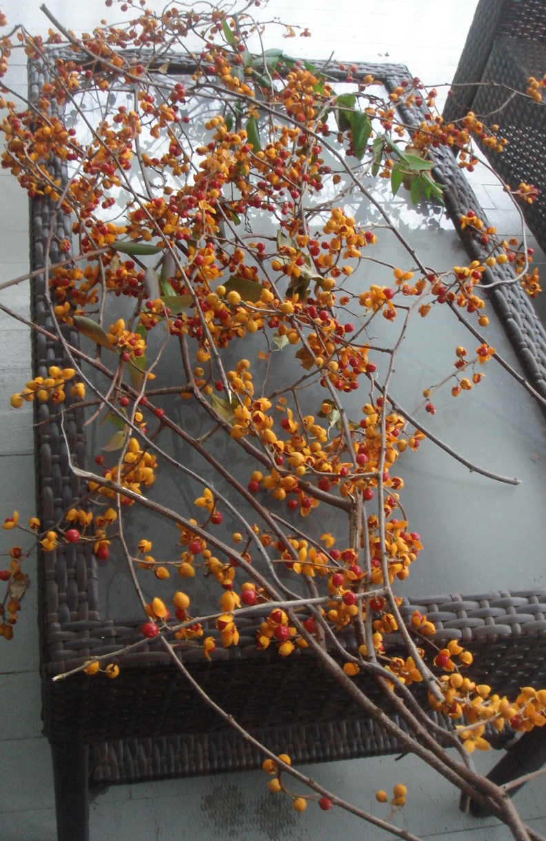 Bittersweet. Growing up in our family, we needed a bumper sticker on our car that read, “I brake for foliage”. Mom kept pruning shears in the trunk and cat tails, bittersweet, and pine cones weren’t safe. Obtaining these items usually involved traipsing through marshes, climbing trees, or some other uncomfortable feat. This week I found myself standing on the road that runs along my house, with a large pair of pruning shears pulling bittersweet out of the tree while cars whipped by. I’m grateful to have a mother who taught me to stop at nothing to create beauty.